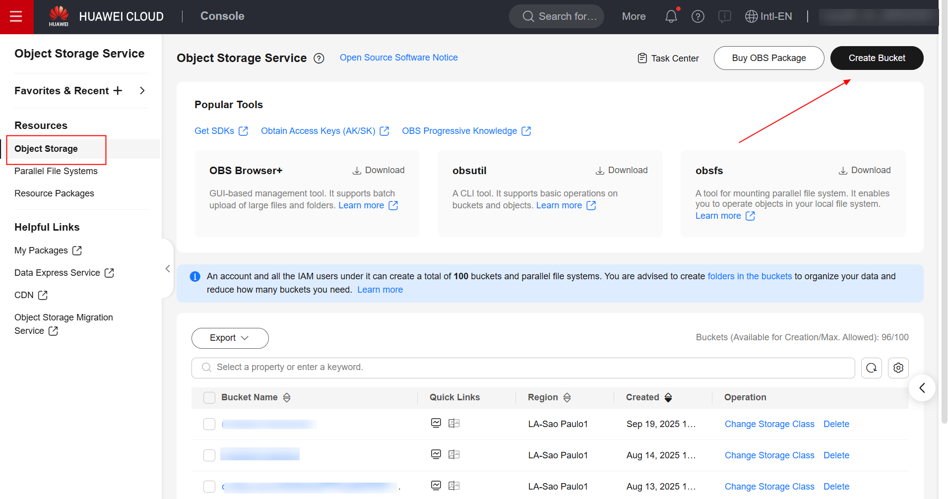 First, you need to create a bucket in the OBS service to store the training code to be executed and the execution logs of the task. To do this, navigate to the OBS service in the Huawei Cloud console and create a bucket.