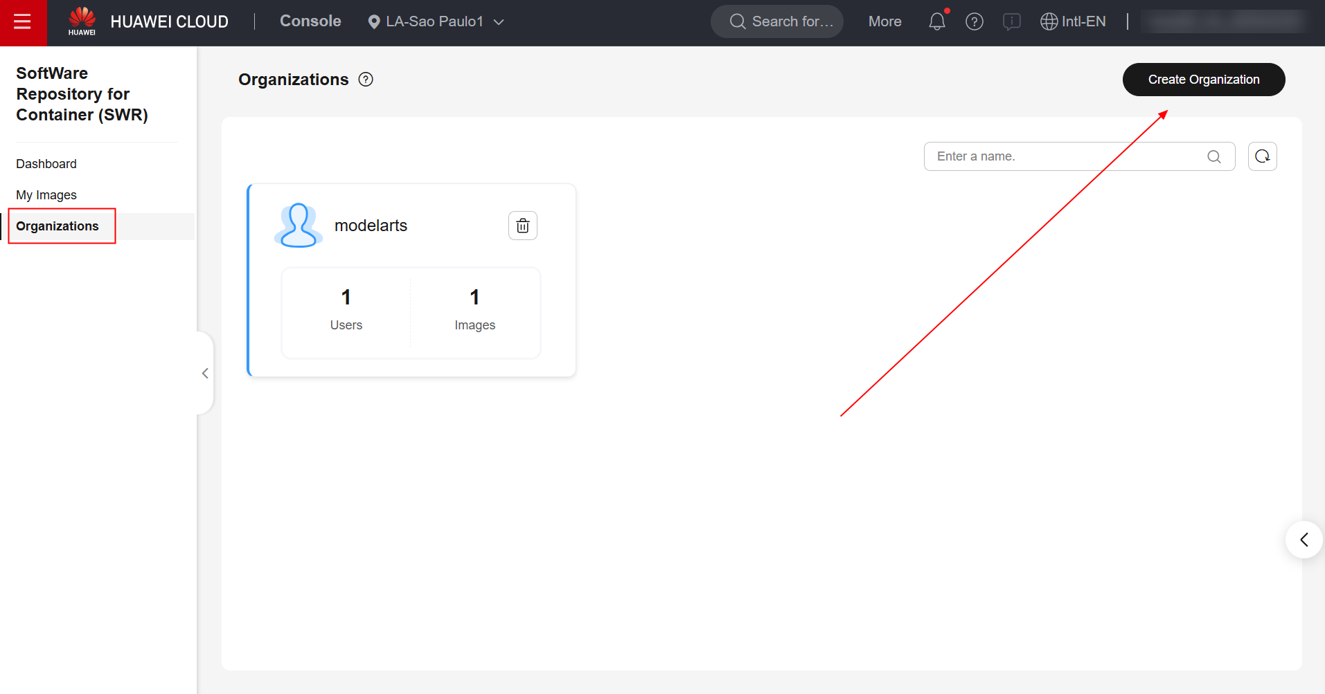 Once you’ve built the image, navigate to the SWR service in the Huawei Cloud console and create an organization.