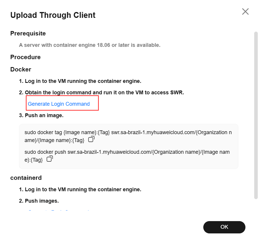 After creating the organization, navigate to the “My Images” section in the left panel and click “Upload Through Client.” Once done, click “Generate Login Command,” copy the generated login command, and paste it into the ECS.