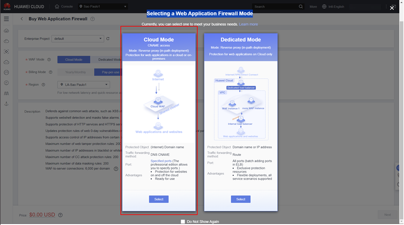 First, we need to purchase an instance of Web Application Firewall in the console, to do that go to Service List > Web Application Firewall > Buy WAF > Cloud Mode.
