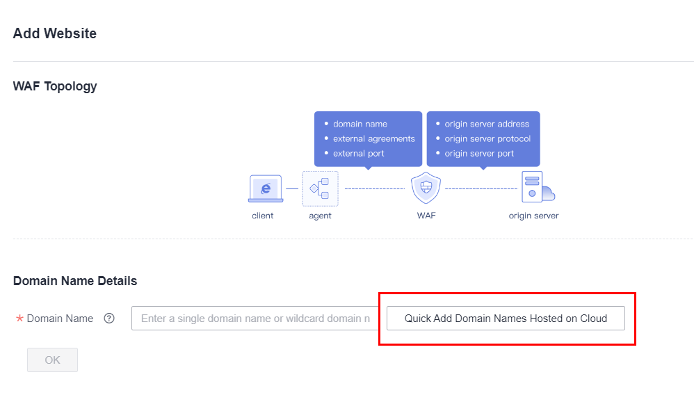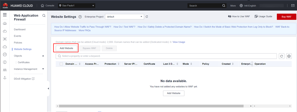 To secure your website with WAF, navigate to the WAF console and access the “Website Settings” section. Then, proceed to add the desired website by following these steps: