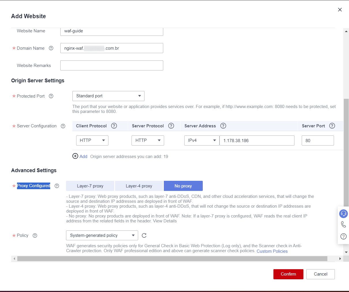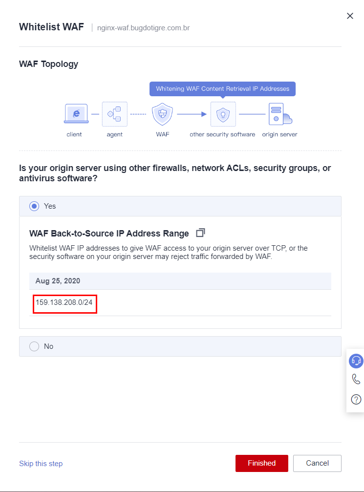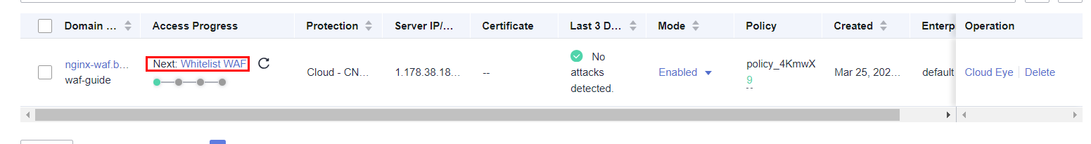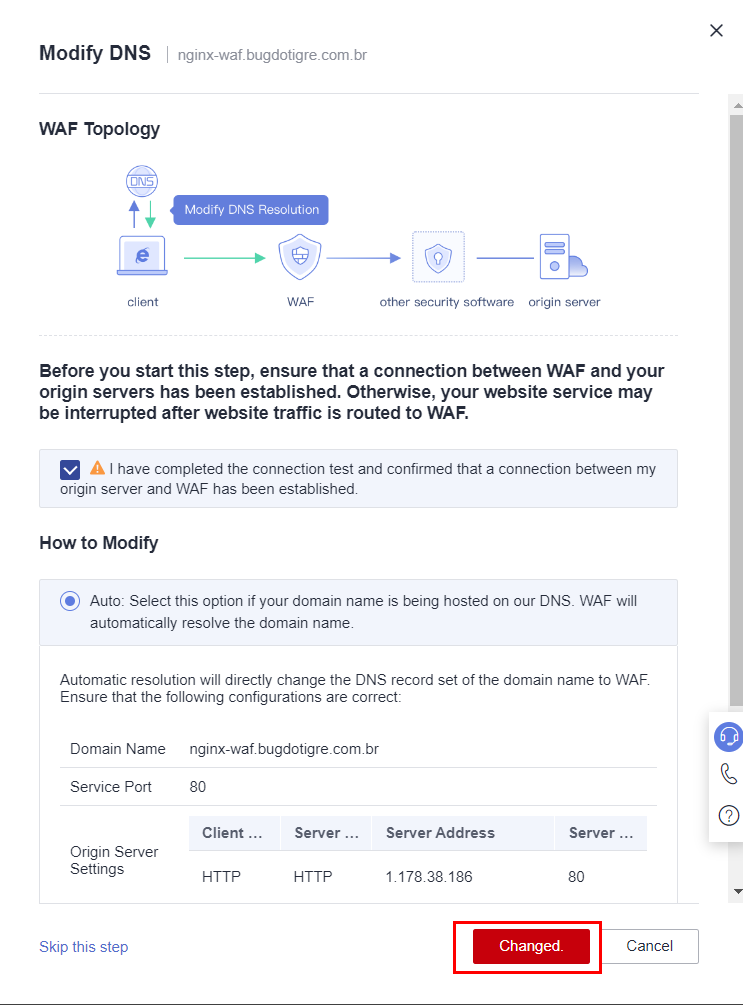 Please ensure that the connection between WAF and your server has been successfully established before proceeding.