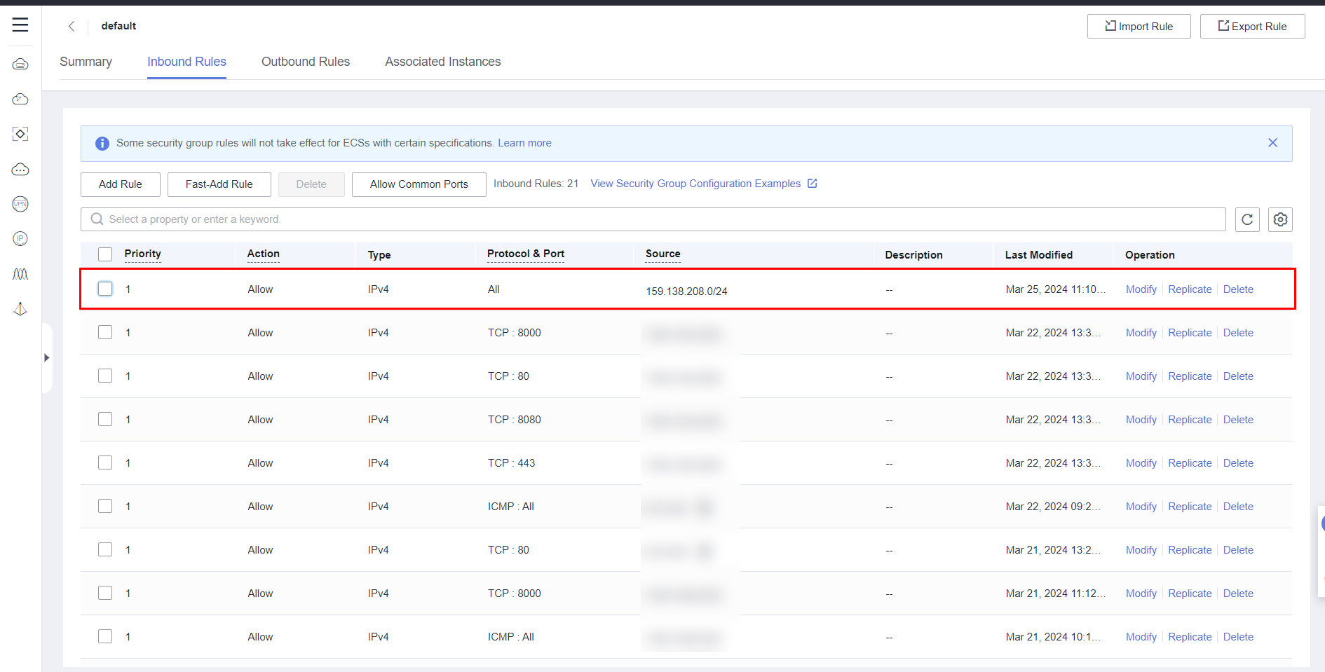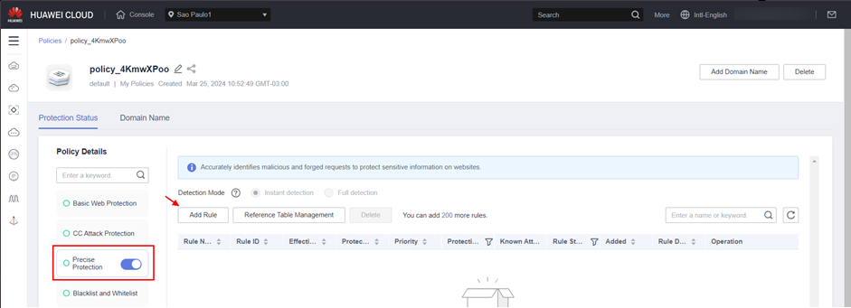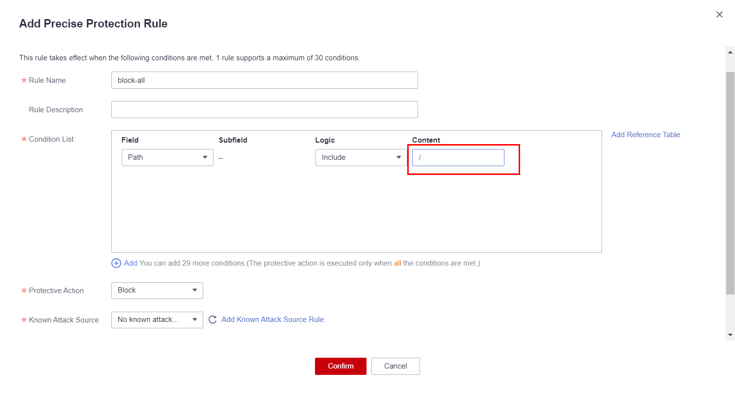 In the WAF console, access the auto-generated policy and create a Precise Protection rule to block all traffic for a test: