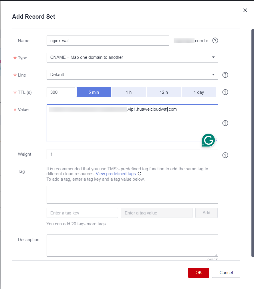 To configure WAF effectively, you need to adjust DNS settings. Start by removing the existing A-type record for “nginx-waf.example.com.br”. Then, create a new record set using the CNAME type. Specify the desired domain name, like “nginx-waf.example.com.br”, and point it to the domain provided by the WAF service.