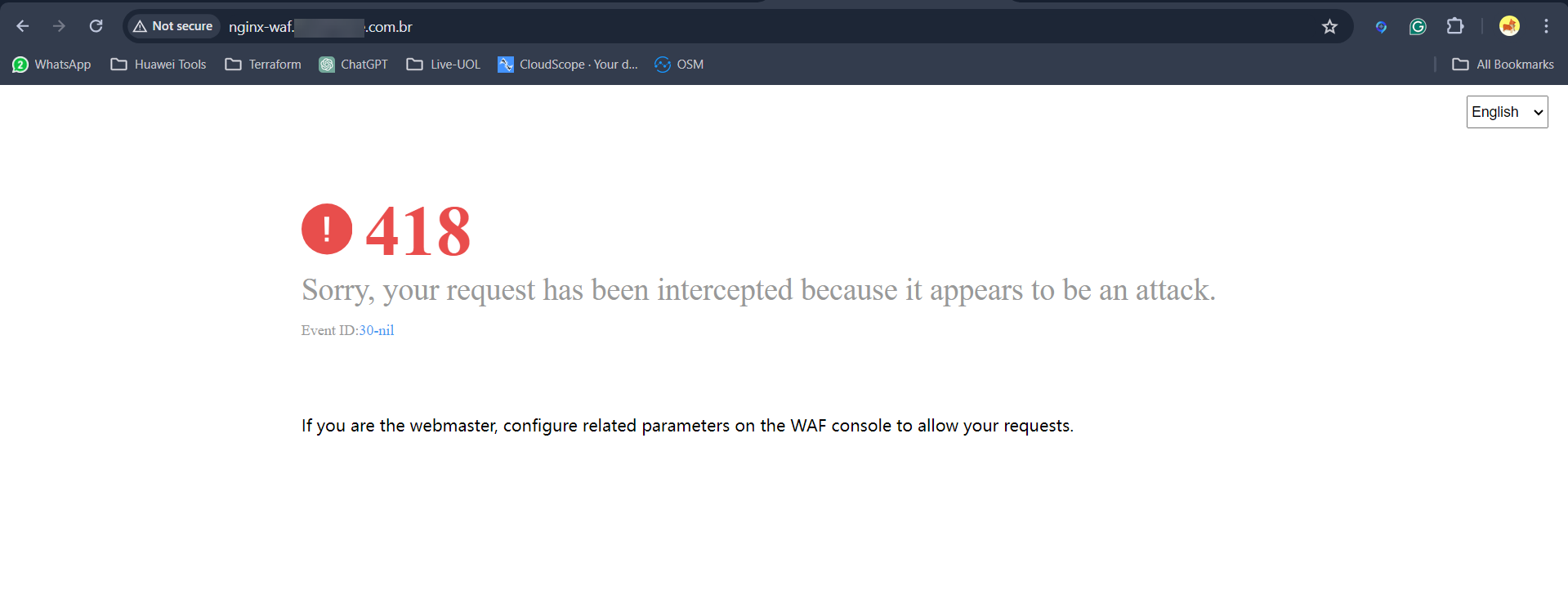 Now, if we attempt to access our “nginx-waf.example.com.br” address, the configured WAF rule will block all incoming traffic.