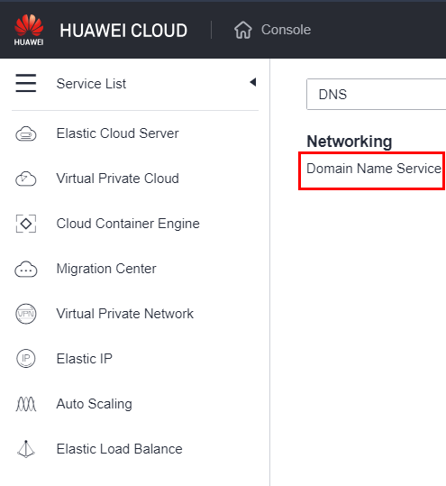 Accessing DNS Service: Initiate the process by navigating to the DNS service within Huawei Cloud.