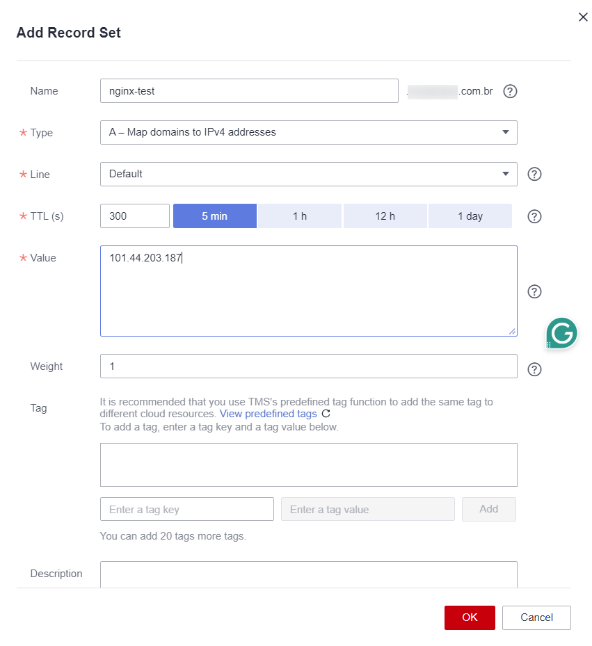 In this example, we have an ECS with an NGINX server installed in it with the public IP 101.44.203.187, if we want to point a Domain name to that IPv4, we create a Record Set A – Map domains to IPv4 Addresses, and in the value, we put the IP that we want to translate: