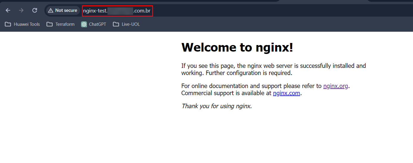 Now, if we type nginx-test.example.com.br, it will redirect the NGINX application: